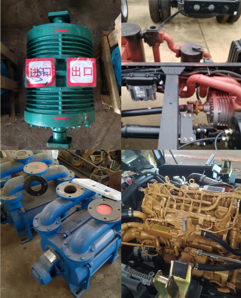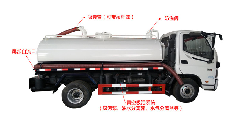 吸糞車專用部分由取力器、傳動軸、真空吸污泵、油水分離器、水氣分離器、防溢閥、壓力罐體、液壓部分,管網(wǎng)系統(tǒng)、吸污導(dǎo)管、自流閥、真空壓力表、視糞窗、洗手裝置等組成。罐體采用Q235碳鋼板制作,罐體封頭一次壓鑄成型,吸污導(dǎo)管可自吸自排,隨車配置大功率真空吸污泵。