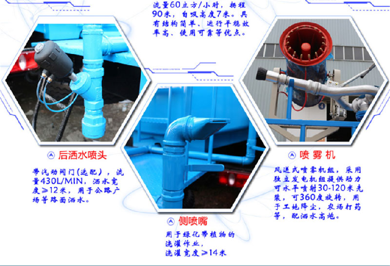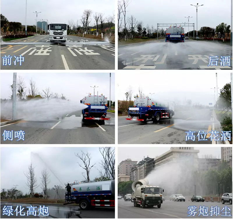 上裝配置:罐體采用國標Q235碳鋼板材制作,產品質量成熟可靠,設計**合理,比同類灑水泵吸程遠、壓力大、使用壽命長,可泵進泵出。前沖、后灑、側噴、高位花灑、帶后工作平臺及綠化灑水高炮(可全方位旋轉,可連續(xù)調成直沖狀、大雨、小雨、毛毛雨等),抑塵霧炮(可降塵、噴霧、消毒、打農藥等),水位計,消防栓接口、快速接口、兩根輸水管,其余標配。